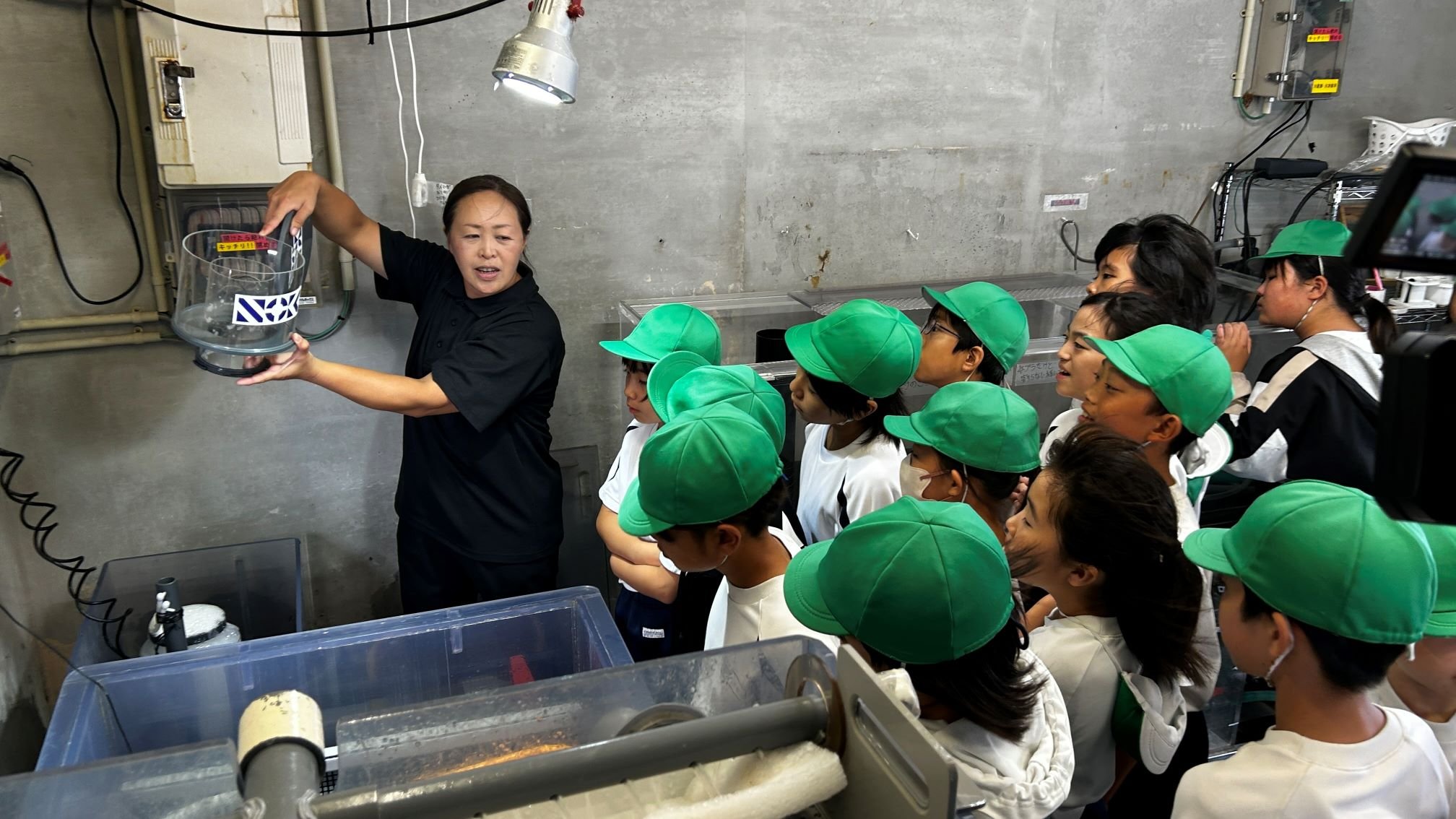 A total of 54 fourth- and fifth-grade students took part in the ceremony. Afterward, they visited the turtle care room, where the newly installed protein skimmer had been set up in the aquarium. The students observed how the device kept the water clean and learned how to maintain it. Some commented, “We want to use the protein skimmer carefully and raise healthy turtles.”