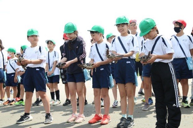 Omaezaki City is the northernmost point in Japan where large numbers of loggerhead turtles come ashore to lay eggs. Part of the city's coastline has been designated a national natural monument. To protect these valuable turtles, conservation activities began in the 1960s, led by Omaezaki Elementary School and supported by the local community. Since 1977, the school has conducted turtle observation and care activities for nearly 50 years, using this approach to educate the next generation about the importance of conservation and the local natural environment. Today, the program is led mainly by fifth-grade students. The children raise some of the hatchlings until they are large enough to be released back into the sea. This year, the care program commenced in September and will continue for approximately 10 months, concluding in early summer next year. Fourth- and fifth-grade students are responsible for feeding the turtles, changing the water, and monitoring their growth and development. Through this experience, they develop awareness of environmental issues, learn the value of life, and nurture compassion.