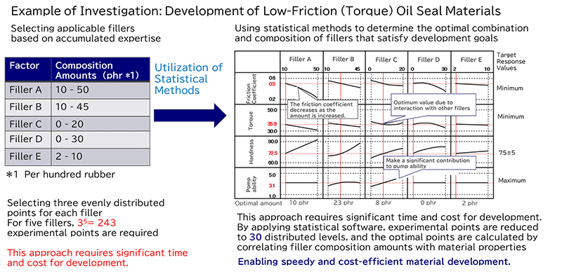 Statistical methods are designed to handle complex parameters (variables), reducing the number of experiments needed to determine optimal values to only the minimum required. For example, suppose that five different fillers with varying blending ratios should be used when developing low-friction oil seal materials. To calculate the optimal blending ratios that meet requirements like friction coefficient and hardness, selecting three blending ratios for each filler would require over 200 experiments (35 = 243 in a simple calculation). With statistical methods, the number of experiments can be reduced to 30. Since experiments typically take a long time, 200 experiments might require about a month, whereas statistical methods can shorten this to just five days. NOK utilizes analytical software to apply statistical methods. Engineers involved in material engineering study statistical methods daily, and every one of them possesses the analytical skills necessary for this approach.
