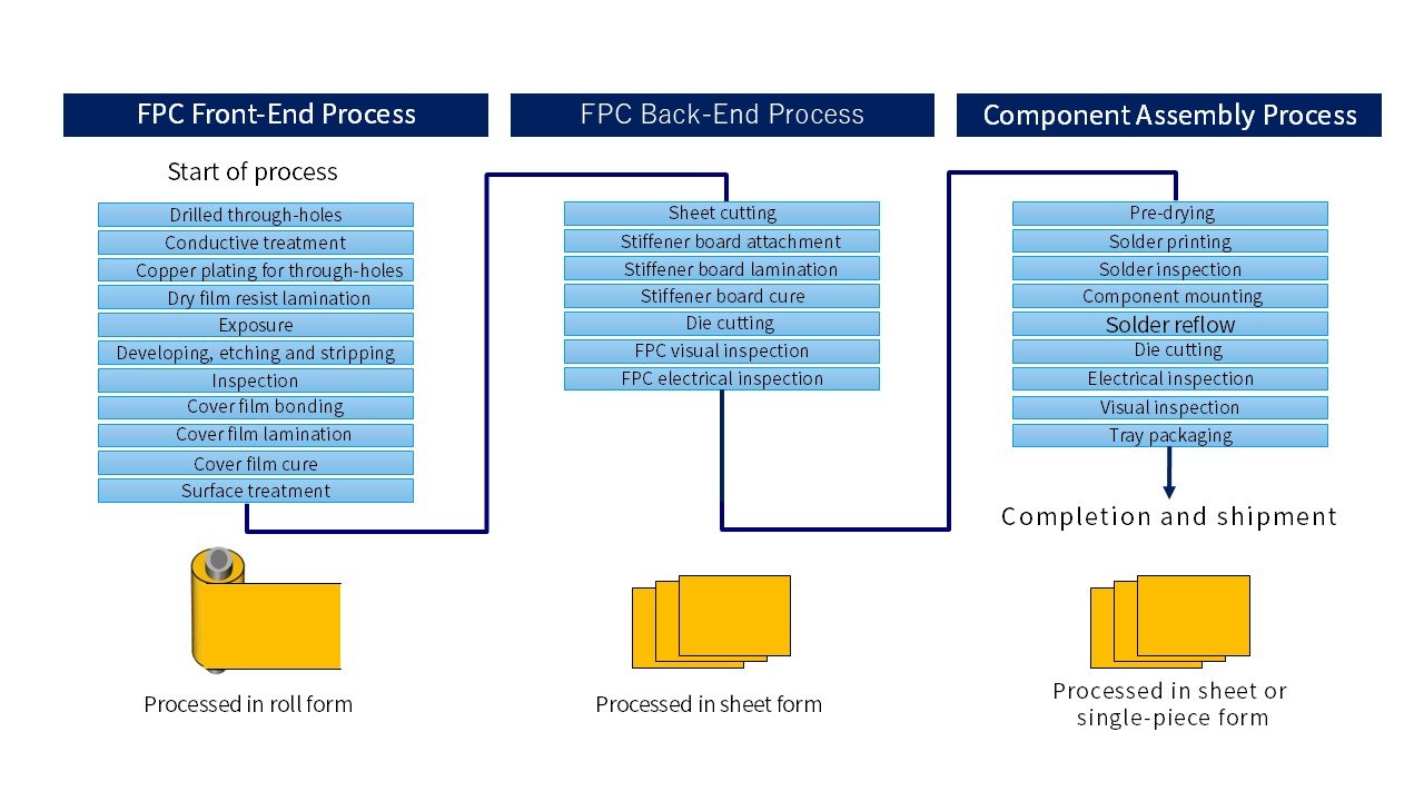 FPC primarily consist of three components: an insulating film (polyimide), copper foil, and adhesive. The key feature lies in their thin, lightweight, and highly flexible structure. Thanks to these characteristics, FPC offer greater freedom in design and circuit layout, accelerating the shift from conventional rigid boards and wire harnesses to flexible printed circuits. The manufacturing process of FPC is divided into front-end processes, including circuit and insulation layer formation, and back-end processes, from shape processing to final inspection before shipment. Each step requires sophisticated technology and precise control.