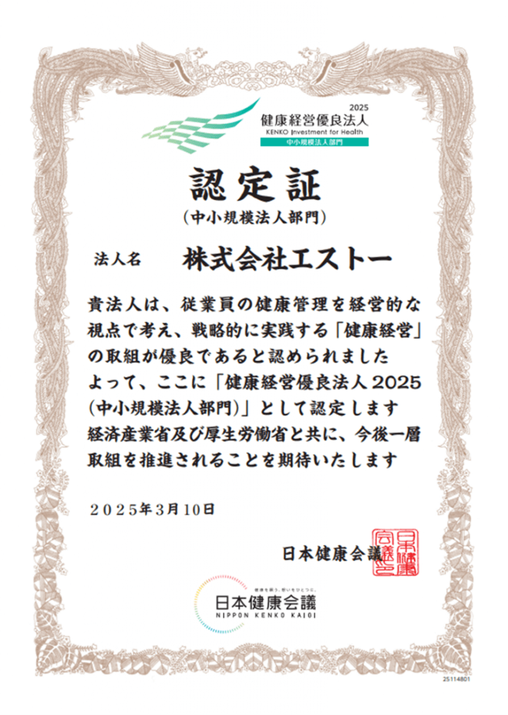 株式会社エストー(本社:大阪府大阪市生野区 代表取締役社長:中村憲治)は、3月10日(月)「健康経営優良法人2025(中小規模法人部門)」に正式認定されましたのでお知らせいたします。