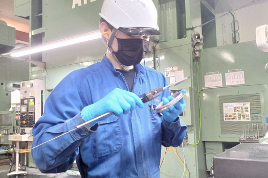 大型のプレス機械と金型を用いて、薄鋼板材からオイルシールの骨組みとなる金属環を生産する、プレス機のオペレーターをしています。以前は金属環を切削する部署で、切削機のオペレーターも経験しており、その知見が現在の仕事に生かせています。日々業務に責任感を持って取り組んでいます。